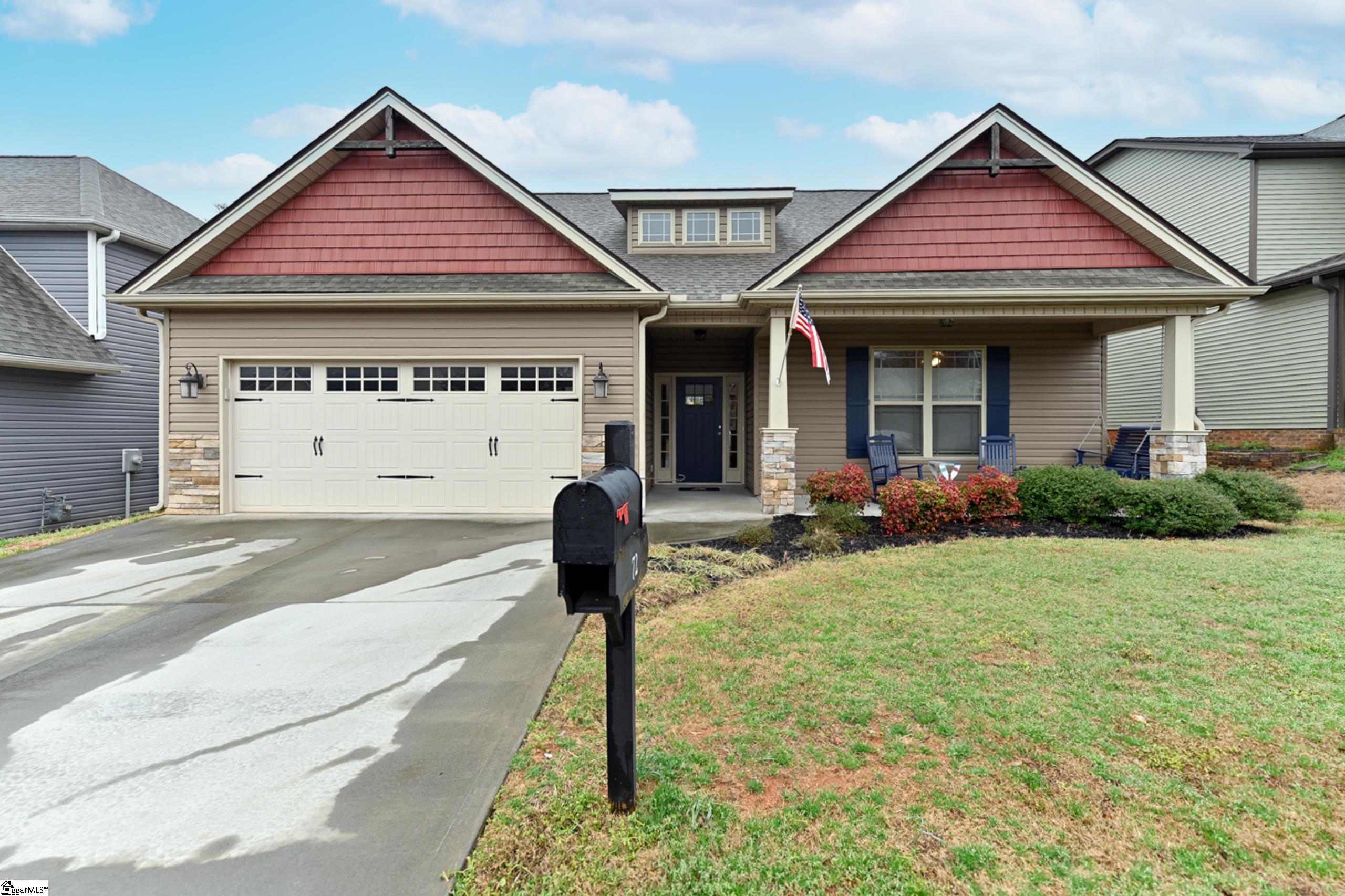 MOVE IN READY & SPECTACULAR 1.5 STORY CUSTOM BUILT HOUSE ! The curb appeal and beautiful covered front porch will welcome you home. You will be amazed at the gorgeous kitchen with a huge center island with granite counter top and roll out drawer storage in the island and lower cabinets throughout the kitchen. The subway tile backsplash is classic and timeless. The white cabinets have satin nickel hardware. You wont be cooking in the dark, there is ample amount of recessed lighting.There is a convenient walk in pantry and the Frigidaire Stainless appliance package will remain including the refrigerator. There is a spare refrigerator in the garage that will also convey. So you will have plenty of food storage for when you host those memorable gatherings. The kitchen freely flows into the large great room with smooth vaulted ceiling and fireplace with ventless gas logs and decorative mantel. Located just off of the dining area is access to a 16x12 covered patio and a 26x10 open air grilling patio. The covered patio is ready for the TV so you won't miss your favorite sporting event and enjoy the outdoors with a sodded yard and irrigation system. There is an electrical outlet installed by the patio in case you want to install a hot tub. The owners suite has two walk in closets plus a large linen closet. The custom up and down split shades will remain. This allows you to let the natural light in and retain privacy. The owners spa bath has a double vanity and a five foot shower. There isn't any wasted space in this house and you will appreciate the amount of storage this fantastic floorplan provides. The oversized laundry room has additional storage and washer and dryer that will convey with the house. This is a popular split bedroom plan with a bonus room / rec room that could aslo be used as a home office upstairs. As far as convenience, Pebble Creek Village is centrally located near Paris Mountain and only approximately fifteen minutes to Downtown Greenville, SC and Travelers Rest. The front porch swing and rocking chairs do not convey.
